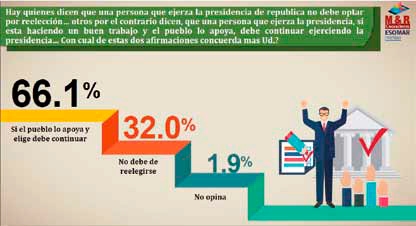 En cuanto a la pregunta sobre “hay quienes dicen que lo más importante es que existan elecciones y que el gobierno cambie cada cierto tiempo”, el 62.1% respondió que la democracia debe tener como propósito ofrecer oportunidades reales para mejorar la calidad de vida de las personas y el 34.9% se enfoca en elecciones y cambio periódico de gobierno. Así mismo, el 66.1% está a favor de la reelección de las autoridades de la Presidencia.
