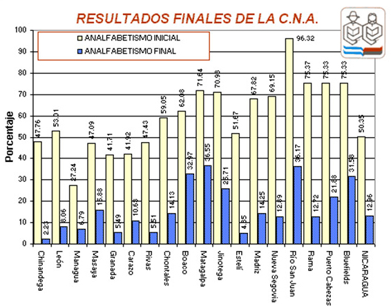 Al final de la Jornada, en el Parte Final de la CNA se informó: “Que después, de cinco meses de ardua lucha en campos, montañas y ciudades, hemos logrado enseñar a leer y escribir a 406,056 nicaragüenses, reduciendo la tasa de analfabetismo de un 50.35% a un 12.96%, de la población mayor de 10 años. Además, están próximos a terminar su proceso de alfabetización, 42,639 compañeros. Además “que el día 30 de Septiembre comienza la alfabetización en Lenguas, de 16,500 nicaragüenses en la Costa Atlántica.”, que permitió adaptar los programas de alfabetización a la realidad cultural, étnica y lingüística de los aborígenes y afrodescendientes, contribuyendo de manera importante a la reducción del analfabetismo y a la revolución cultural del Caribe.