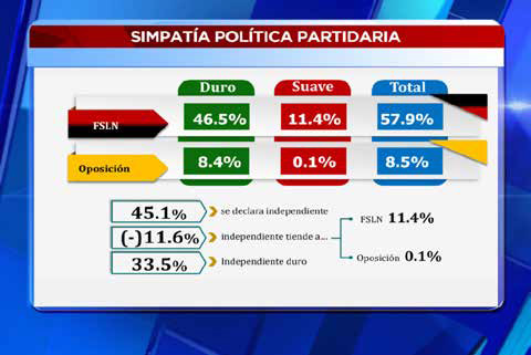 El sondeo de opinión revela que el partido Frente Sandinista de Liberación Nacional (FSLN), cuenta con un 57.9 por ciento de simpatías entre los nicaragüenses, en tanto toda la oposición unida solo cuenta con un 8.5 por ciento de simpatía.