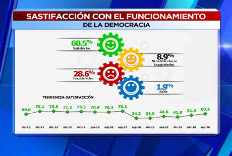 Sobre energía eléctrica domiciliar el 75.6 por ciento opinó satisfacción y el 73.7 aprobó el servicio de alumbrado público en las calles. El 73.2 por ciento de los encuestados dijo sentirse satisfechos con los servicios que se brindan en centros de salud y hospitales públicos donde la atención es gratuita. Un 43.2 por ciento dijo sentirse satisfechos con las oportunidades de trabajo en el país, en tanto un 8.7 por ciento dijo sentirse insatisfechos.