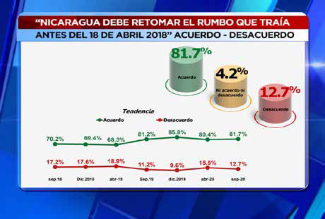 Ante la pregunta de que si Nicaragua debe retomar el rumbo que traía antes del 18 de abril de 2018, cuando se colocaron tranques de la muerte asesinando a policías, trabajadores del Estado, militantes y simpatizantes sandinistas, en un fallido intento de golpe de Estado, el 81.7 por ciento expresó su total acuerdo que el país debe volver a la calma, la paz y tranquilidad que vivía con un notable crecimiento económico.