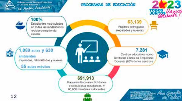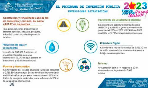 De acuerdo con el informe presentado, en 2022 la administración del presidente Daniel construyó 4 mil 865 calles a través del Programa Calles para el Pueblo y entregó 2 mil millones 305 mil córdobas en créditos justos mediante el Programa Usura Cero.