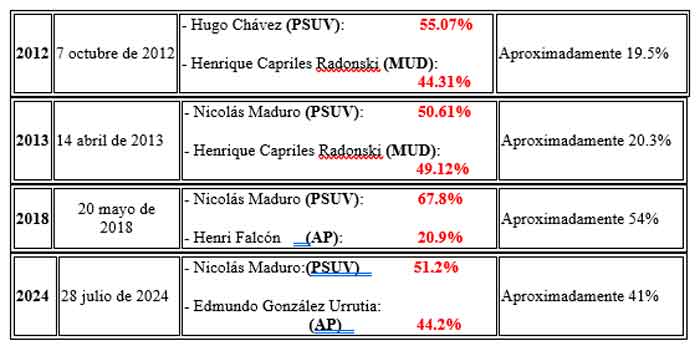 La población de Venezuela en 2024 es de aproximadamente unos 32 millones de habitantes. Su población votante está dividida por grupos etarios partiendo de los 18 años de edad mínima para votar. Las últimas cuatro elecciones presidenciales en Venezuela han sido entre el Partido Socialista Unido de Venezuela (PSUV) y la Mesa de la Unidad Democrática (MUD) o sus candidatos afiliados. Los resultados arrojados han sido.