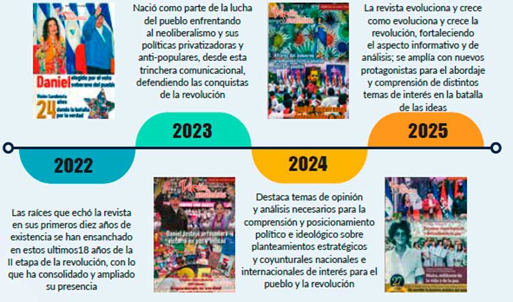 Las raíces que echó la revista en sus primeros diez años de existencia se han ensanchado en estos ultimos18 años de la II etapa de la revolución, con lo que ha consolidado y ampliado su presencia, mejorado el ámbito de información, reflexión y análisis; divulgando los logros y avances del gobierno sandinista, la historia de lucha sandinista y los temas nacionales e internacionales de mayor relevancia en cada momento, bajo la conducción de los Copresidentes Daniel y Rosario Murillo.